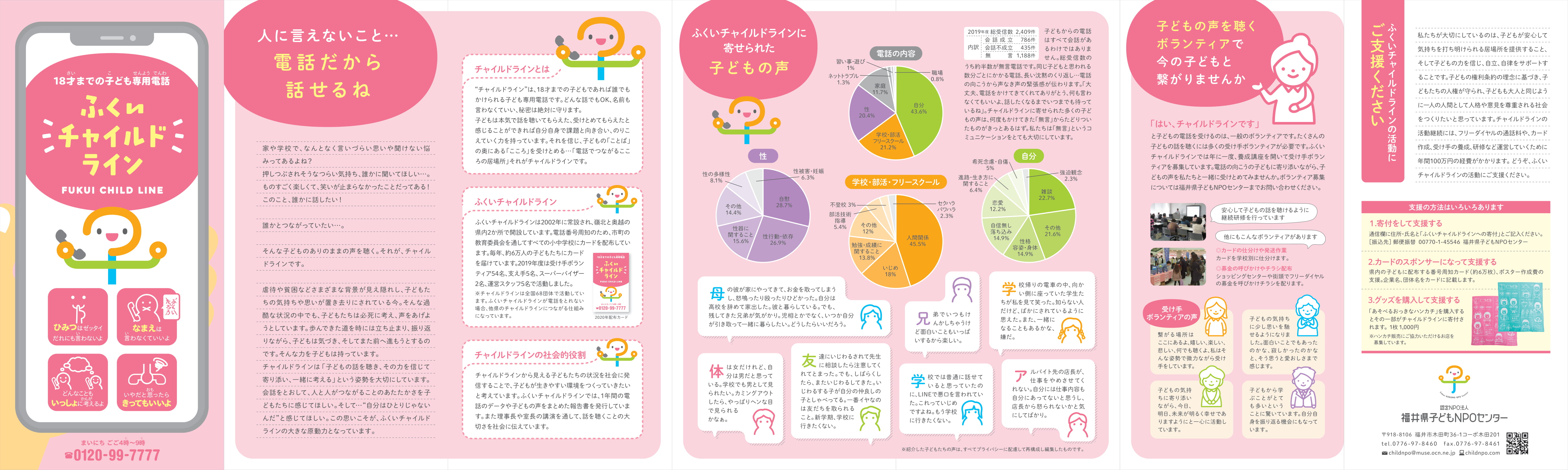 福井県子どもNPOセンターの活動内容などをお知らせするリーフレットができました。 たくさんの方に福井県子どもNPOセンターを知っていただくため、リーフレットの配布にご協力いただけるお店、団体などございましたら是非ご連絡ください。 福井県子どもNPOセンター事務所 TEL 0776-97-8460